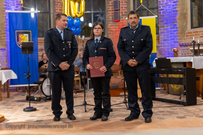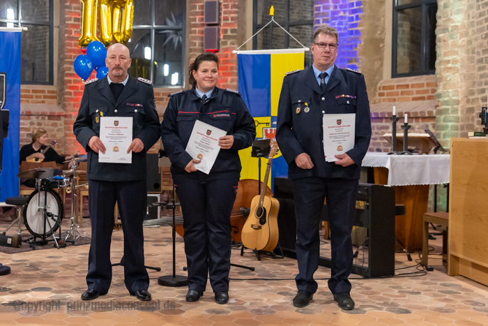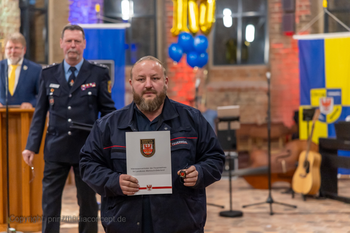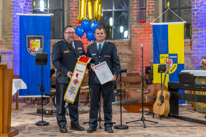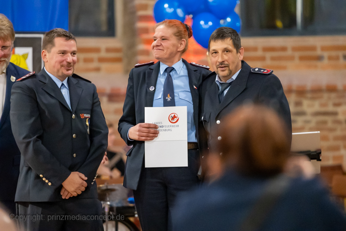 Der Vizepräsident des Landesfeuerwehrverbandes Daniel Brose überreichte eine Ehrenschleife und zeichnete den Kameraden Dirk Hartinger mit dem Brandenburger Feuerwehr-Ehrenkreuz in Silber und den Kameraden Robby Menzel mit dem Ehrenkreuz in Bronze aus, wobei die Überreichung erst am Sonnabend stattfand. Die Jugendwartin Anja Rosch erhielt von der Landesjugendfeuerwehr eine Sonderehrung.