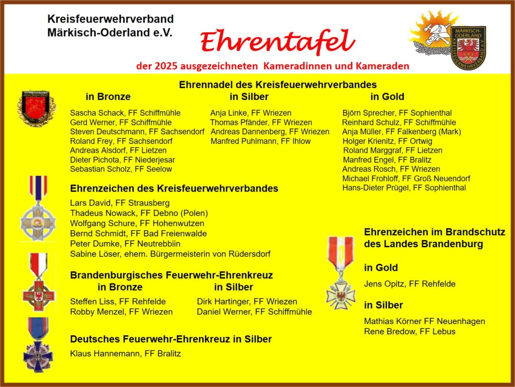 Im Jahr 2025 sind für ihre hervorragenden Leistungen im Brand- und Katastrophenschutz verdiente Kameradinnen und Kameraden mit Verbandsauszeichnungen auf Deutschland-, Landes- und Kreisebene sowie mit staatlichen Auszeichnungen auf Landesebene geehrt worden. Dazu nochmals unsere herzlichsten Glückwünsche.