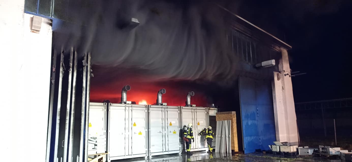 Unter schwerem Atemschutz drangen die Einsatzkräfte in den qualmenden ehemaligen Hangar ein. Dabei erkannten sie, dass es nur in einem von fünf Containern brannte. Das Solarkraftwerk verfügte über eine Gesamtleistung von fünf Megawatt, aufgeteilt auf fünf Zellen. Eine dieser Ein-Megawatt-Zellen hat gebrannt. Noch in der Nacht zog die Feuerwehr den Container mit der brennenden Zelle mithilfe eines Traktors und eines Radladers aus dem Gebäude. und löschten ihn endgültig ab.