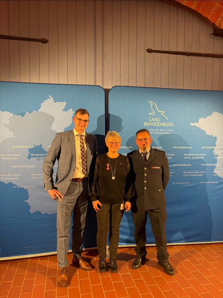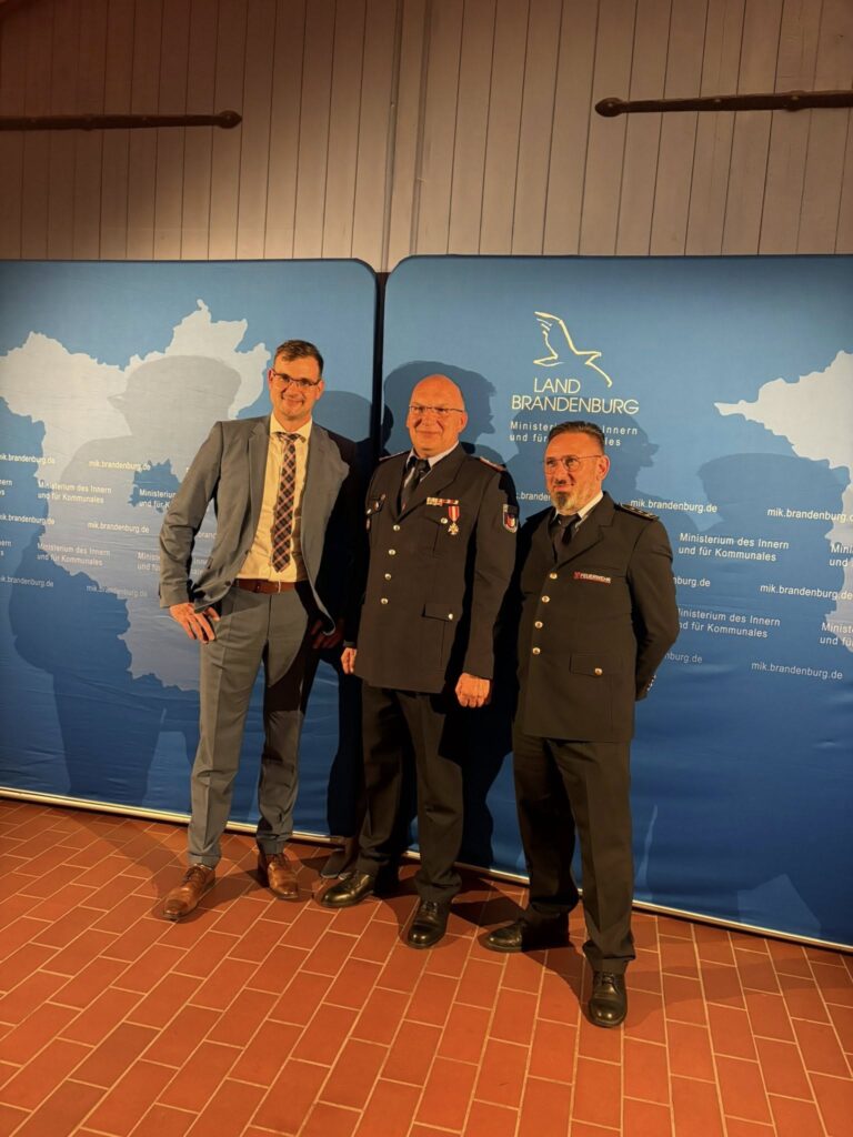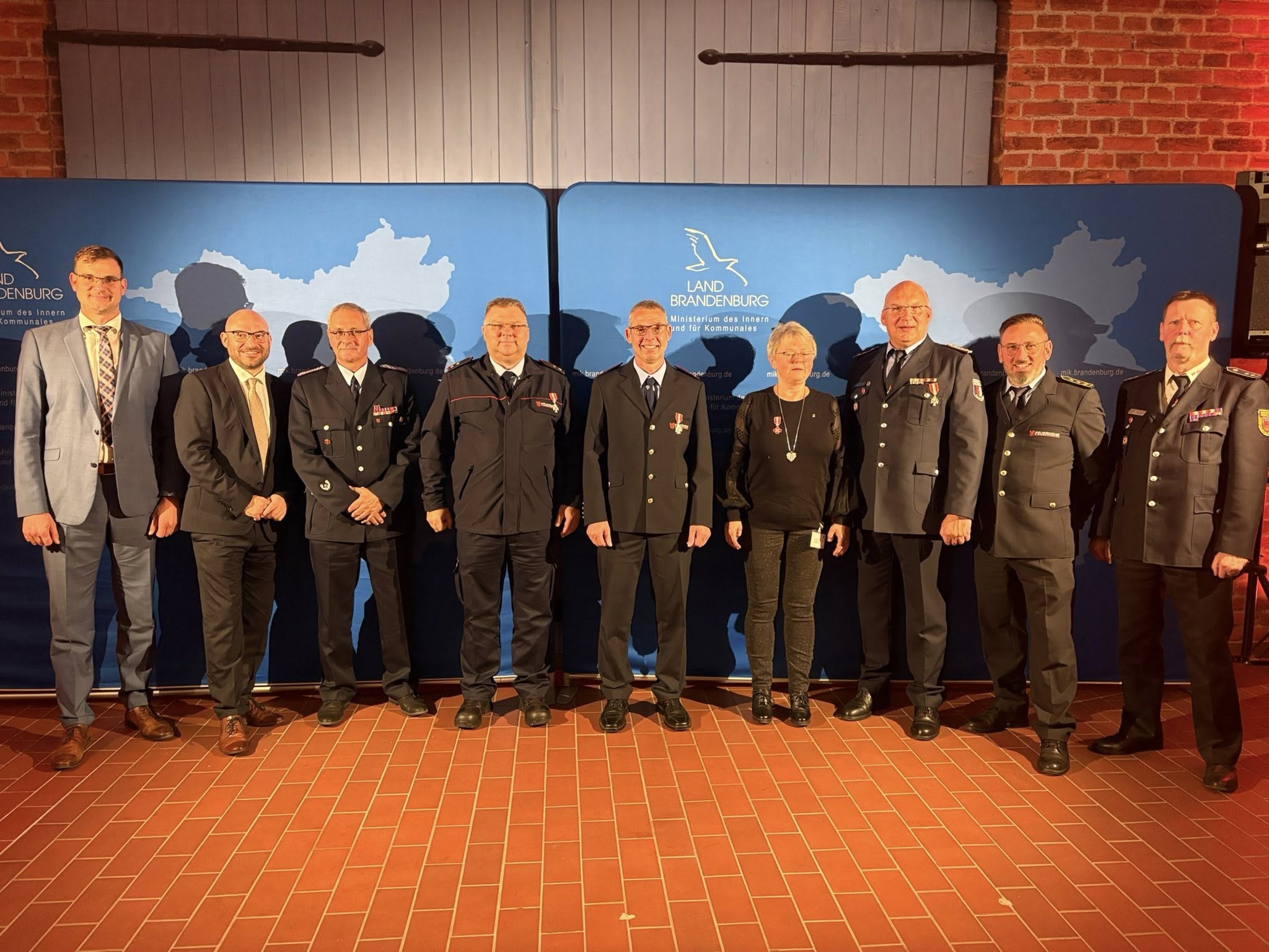 Durch den Minister des Innern und für Kommunales René Wilke wurden am Freitag, den 19. September 2025 im Spargelhof Klaistow verdiente Helferinnen und Helfer sowie Kameradinnen und Kameraden mit den Ehrenzeichen im Brand- und Katastrophenschutz und der Lebensrettungsmedaille des Landes Brandenburg geehrt.
