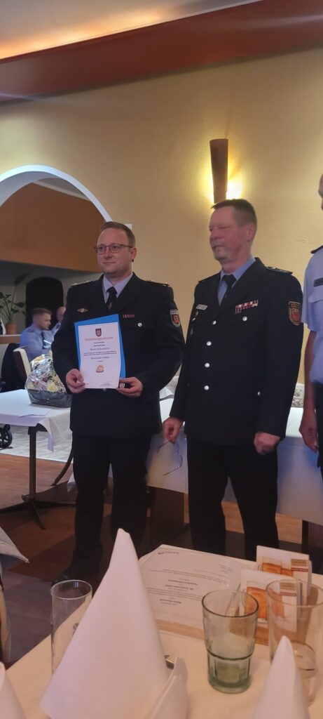 Die Bürgermeisterin Frau Löser und der Gemeindewehrführer Björn Hanneck überreichten mehreren Kameraden Medaillen für treue Dienste, darunter Kam. Jörg Wehrmann von der Ortsfeuerwehr Hennickendorf für 50 Jahre, und sprachen Beförderungen aus.