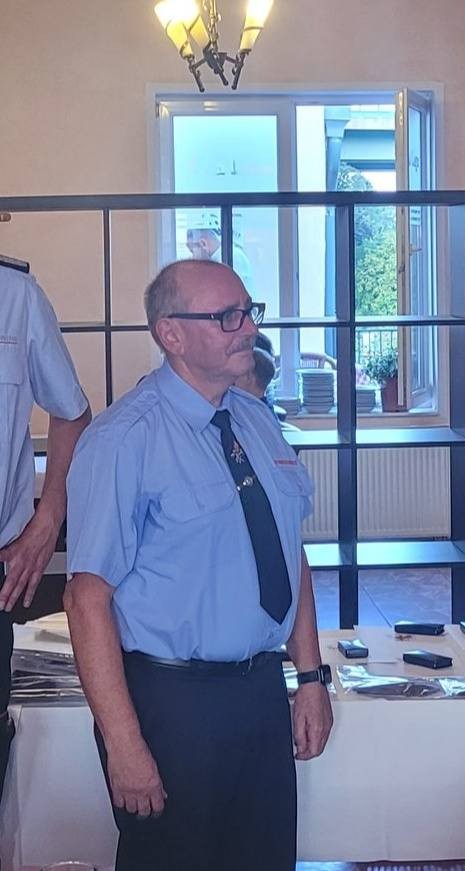 Das Vorstandsmitglied des Kreisfeuerwehrverbandes Uwe Pranzner überreichte Kamerad Matti Schuckert von der Ortsfeuerwehr Herzfelde die Ehrennadel des KFV in Silber.