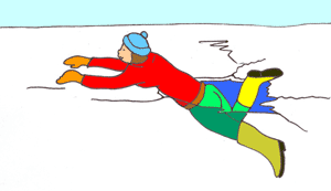 – Versuchen, sich in Bauchlage auf die feste Eisschicht zu schieben. Selbstbefreiung ggf. durch abdrücken der gegenüberliegenden Eiskante mit den Füßen unterstützen.