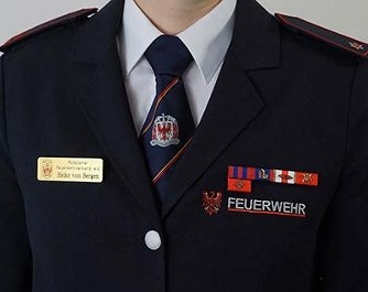 Auf der rechten Brustseite der Jacke/Bluse oder dem Hemd kann das mögliche Namensschild auf gleicher Höhe wie das landesbezogene Feuerwehr-Signet und mittig darüber ein mögliches Funktionsabzeichen (wenn nicht auf Schulterstück) getragen werden.