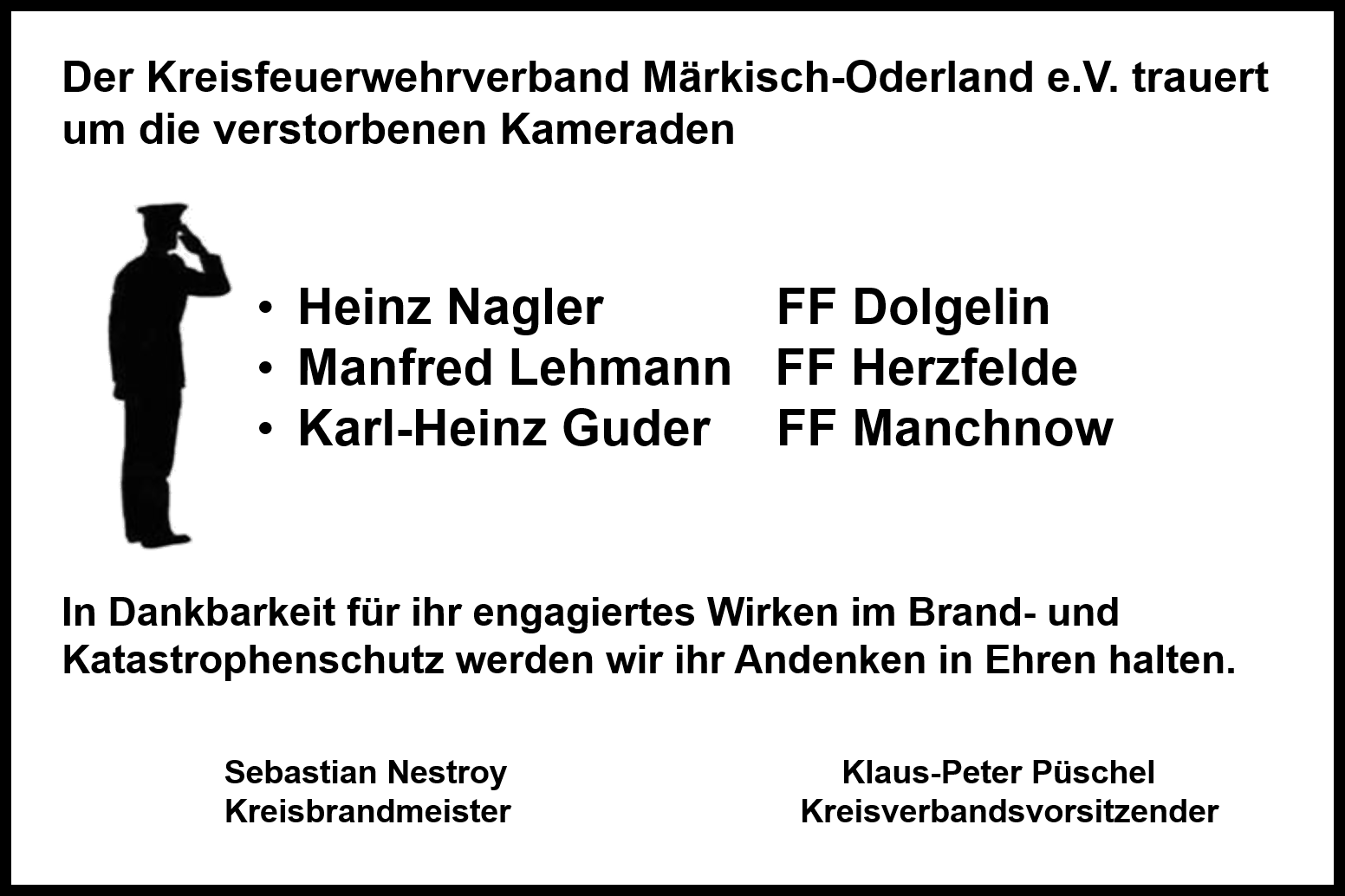 Zusätzlich und auch dort, wo das nicht möglich war, drücken wir mit dieser Traueranzeige unsere Achtung und Dankbarkeit für die Lebensleistung unserer verstorbenen Kameradinnen und Kameraden aus.